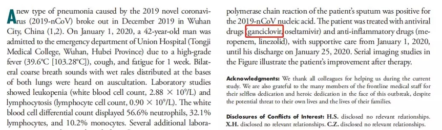 武漢同濟醫(yī)院專家在《Radiology》上發(fā)表的研究提到,1名42歲的患者在2020年1月1日住院,在此期間接受更昔洛韋、奧司他韋以及其他抗菌藥物治療,最終于2020年1月25日治愈出院。