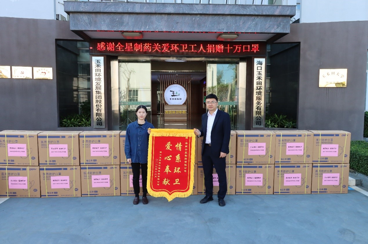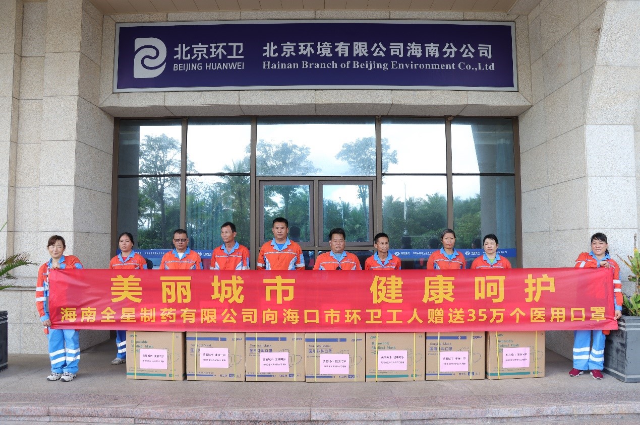 海南全星制藥有限公司向??谑协h(huán)衛(wèi)工人贈送35萬個醫(yī)用口罩